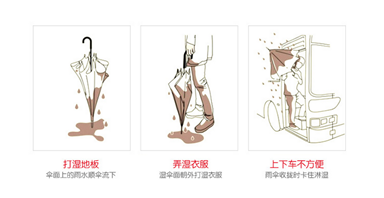 傳統的雨傘,濕掉的傘面在外側,進入室內后,濕的雨傘面會將室內地板弄濕,傘面挨著衣服也會將衣服打濕,上下車門時,傳統雨傘是向內收攏的,會卡住車門,把雨水濺到衣服上淋濕,不方便又很惱人。