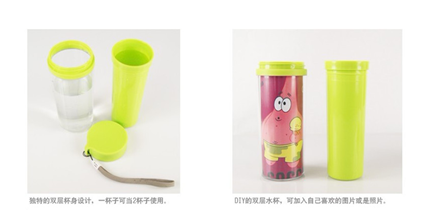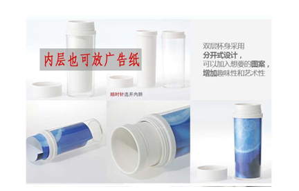 雙層密封廣告運動水杯不僅能隔熱防燙的水杯,出去旅行帶上此款水杯,方便獨特。一個杯子可以當兩個杯子用,同時雙層杯身采用分開式設計,可以加入想要的圖案,內層也可放廣告紙的,增加了趣味性和藝術性。直接可以秀出你的DIY水杯,這樣更有創意性。