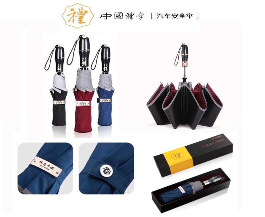 汽車安全傘:集合破窗、安全帶切割器、反光警示于一身,為您出行保駕護航,傘帶金屬銘牌上刻有“祝您平安”,寓意您在行車的途中平平安安,一帆風順!精致金屬“笑臉”傘扣,預示愉悅、快樂與您一路相隨。大氣黑色包裝,燙金字樣,點綴御貢皇禮腰封,盡顯皇家風范,是您送禮品的最佳選擇。