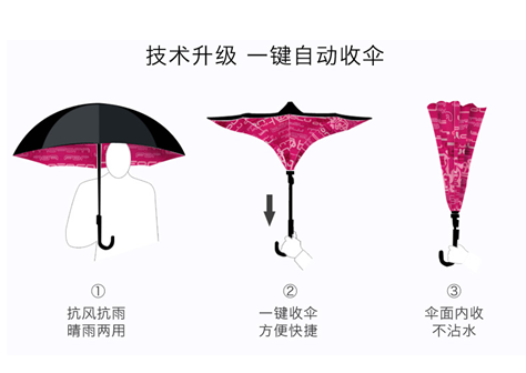 這款德國happyrain反向汽車傘跟傳統(tǒng)的雨傘相比較,傳統(tǒng)雨傘容易弄濕地板,上下車不方便,容易弄濕衣服,容易誤傷旁人.相反而雙層反向汽車專用傘顛覆傳統(tǒng),可站立翻轉(zhuǎn)雨傘,反向傘面收縮技術(shù)小小空間開收雨傘特別適合有車一族.小小的車門風(fēng)就可以開收傘,避免遇水沾濕.一鍵收傘,方便快捷,大傘面,大容量,可擋傘容納2-3人,雙層傘面,雙重保護(hù),內(nèi)外層傘面相互重疊,更加防雨,防曬,色彩艷麗,時尚印花層,不掉色,同時也是公司單位活動禮物饋贈的首選,大方實用,選擇了反向雨傘是不會錯的.
